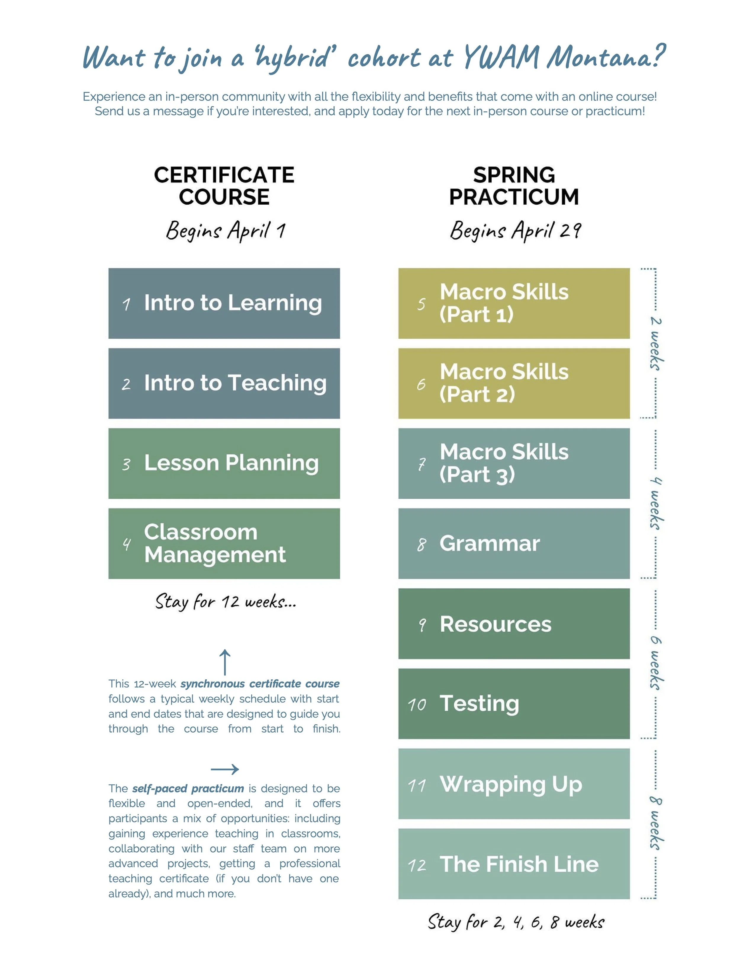 Come to YWAM Montana and join other students and instructors for a ‘hybrid’ TESOL course that is starting here on this date. Or join us from a distance as a student in Citizens TESOL’s online course. This synchronous certificate course follows a typical weekly schedule with start and end dates that are designed to guide you through the course from start to finish. We will be partnering with any other hybrid TESOL cohorts happening at this same time. Learn more about YWAM Montana on their website. | See Pricing Plans for visiting this location.